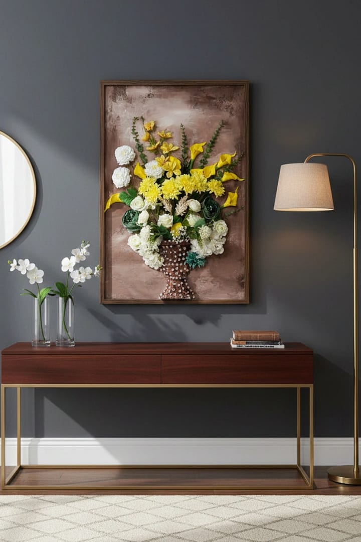 Medium & Construction: This is a Mixed Media Floral Sculpture created using specialized plasters, high-grade artificial flowers, and textured mediums layered over an abstract painted hard board canvas.